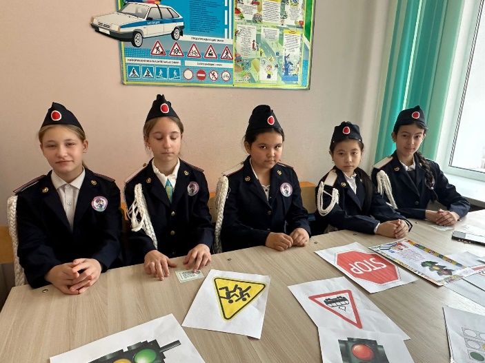 Балалар оқушыларға Жол инспекторлары отрядының жұмысымен таныстырып, негізгі жол қозғалысы ережелерін түсіндіріп, ақпараттық әңгіме мен цифрлық викторина өткізді.