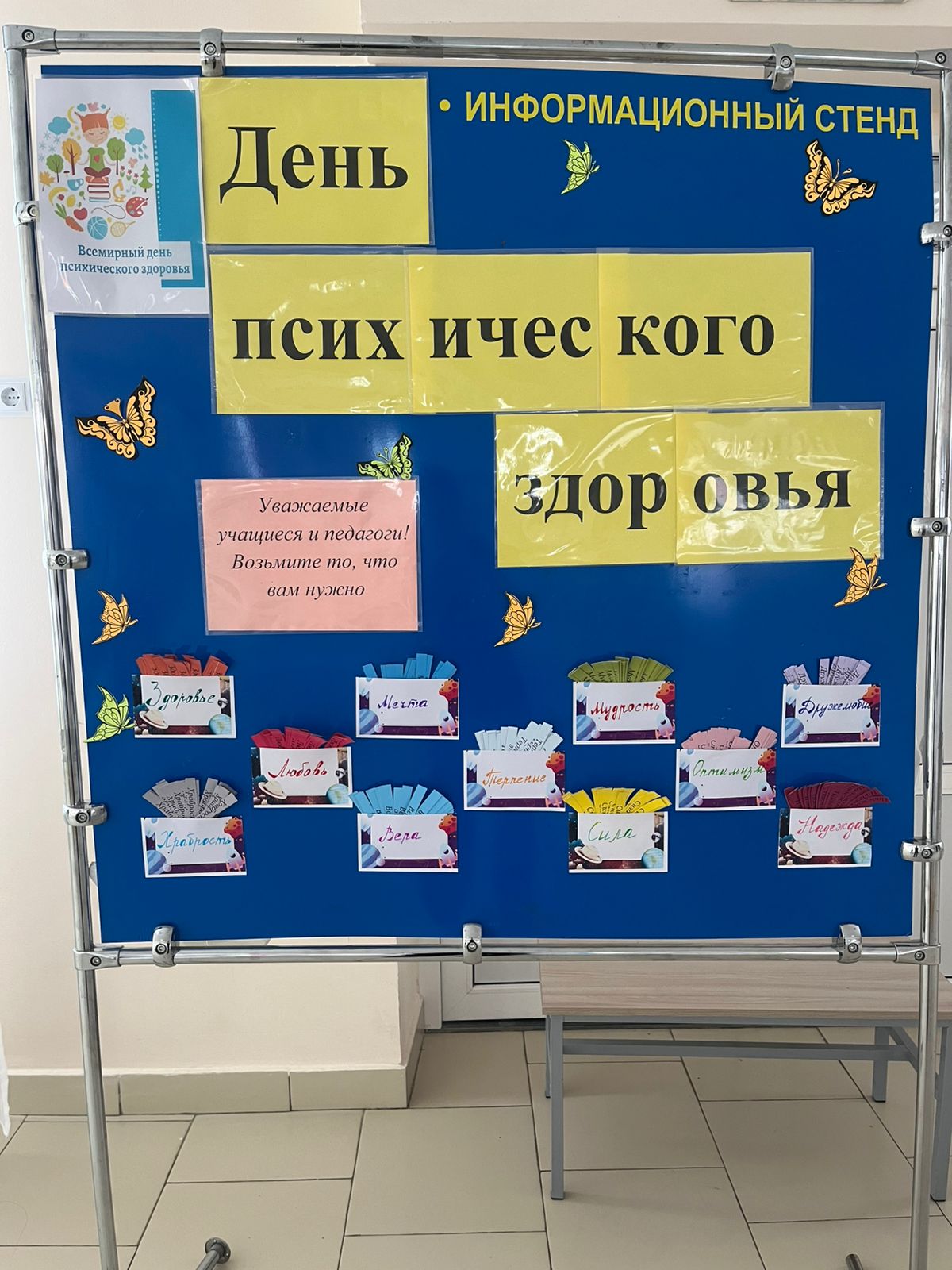 Біздің мектептің 1-қабатындағы фойеде Психикалық денсаулық күніне арналған баннер орналастырылды.